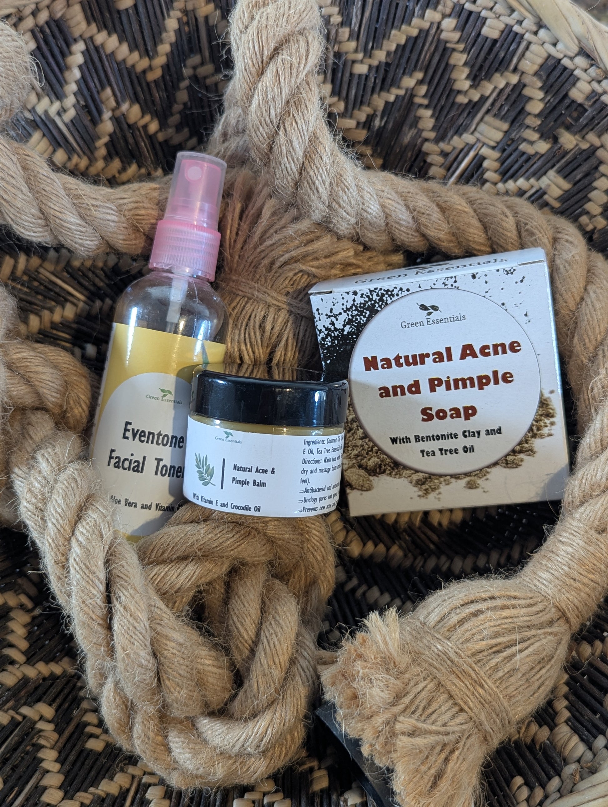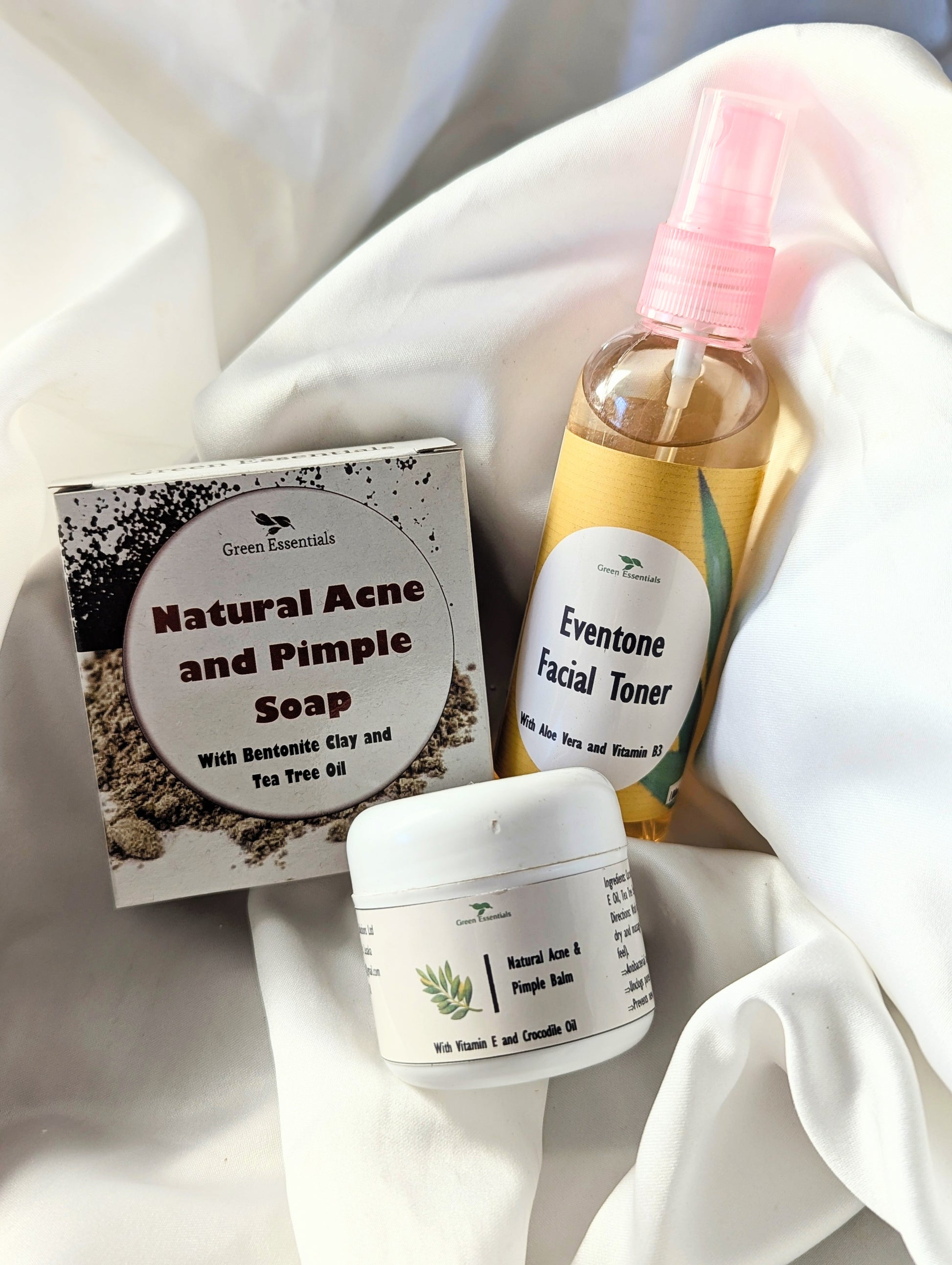 A convenient combo for an easy to maintain routine to fight acne and pimples and attain clearer brighter skin. It includes our Acne and Pimple Soap and balm, Eventone Facial toner and our konjac sponge for gentle, non-abrasive exfoliation